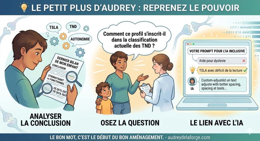 3. Le lien avec l’IA : Saviez-vous que mieux nommer le trouble permet de mieux paramétrer les outils d’IA inclusive ? Un « prompt » qui précise « TSLA avec déficit de la lecture » donnera des résultats bien plus adaptés qu’un simple « aide pour dyslexie ».